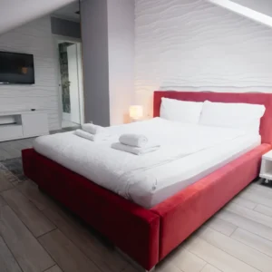 Pokoje czerwone to pokoje z dużym, wygodnym, czerwonym małżeńskim łóżkiem. Nad łóżkiem znajduje się niewielkie okno, które zapewnia dyskretnie wpadające do pokoju promienie słoneczne. Do pokojów przynależy łazienka z oknem. Łazienka została wyposażona w prysznic z deszczownicą, toaletę oraz umywalkę. Wszystko starannie i nowocześnie wykończone.